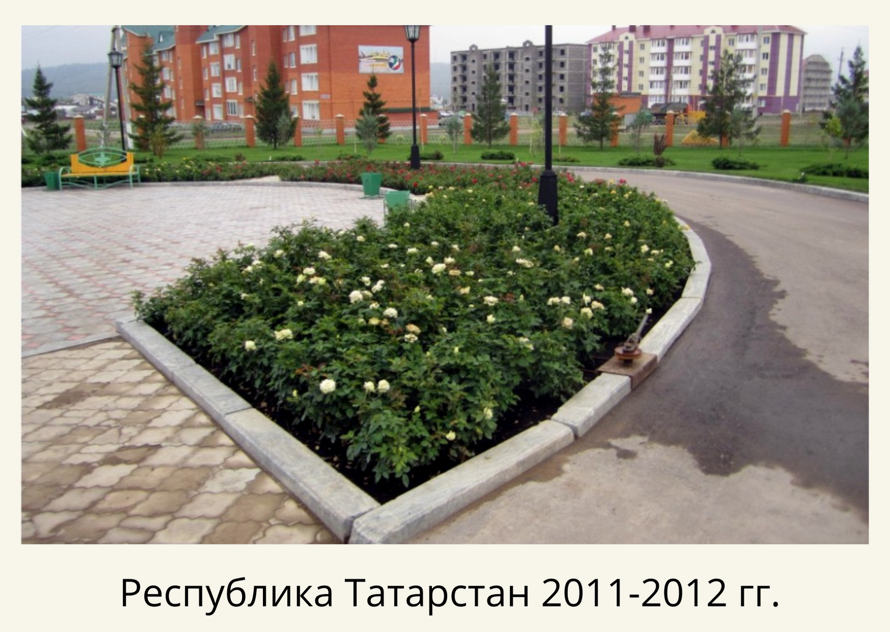 Территории были ухожены, но вместо газона – травяная поросль, цветники переросли, высажено много хвойных растений, но без видимой концепции. Мы постарались исправить данную ситуацию. Удалили сорняки, перекопали, завезли чернозем, постелили рулонный газон и частично отреставрировали существующий на площади 1,5 га. Пересадили и привели в порядок существующие насаждения. Сделали бордюрные цветники с однолетниками (петуния, тагетис, пеларгония, бегония) 10 000шт, рокарии, розарий из бордюрных голландских роз Патио и высадили декоративных хвойных и лиственных растений 1240 шт.
